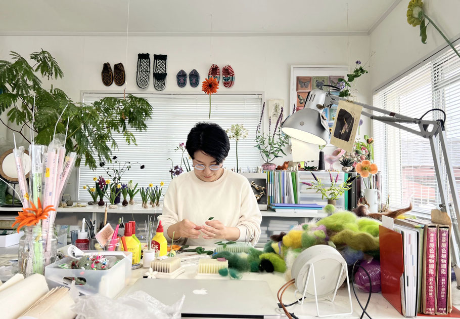 見慣れた空間にいつも植物の気配がする。私はそれだけでほっとして、本当の自分に戻れる気がします。生きた植物たちには到底敵いませんが、植物の個性やエネルギーを含んだ作品が、自分に戻るためのリセットボタン、元気をキャッチするためのアンテナのようなものになってくれたら良いなと思い、日々制作しています。